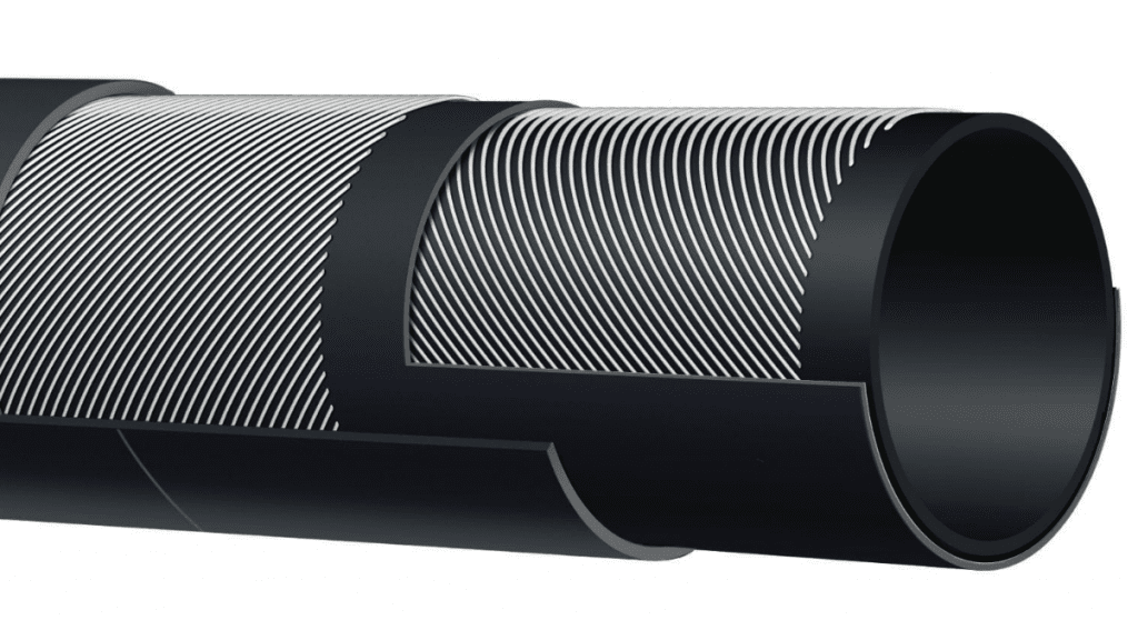 The inner layer of the hose is made of black, smooth EPDM rubber, which is highly resistant to heat and various chemicals. The outer layer is made of the same EPDM-based rubber compound, which is resistant to weather conditions, UV rays, ozone and even oil. The construction is further reinforced by a textile mesh, which increases the mechanical strength, pressure tolerance and flexibility of the hose.